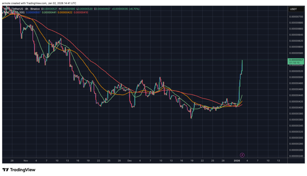 PEPE just ripped 26% higher on January 2, hitting $0.000005106 as trading volume exploded past $800 million.